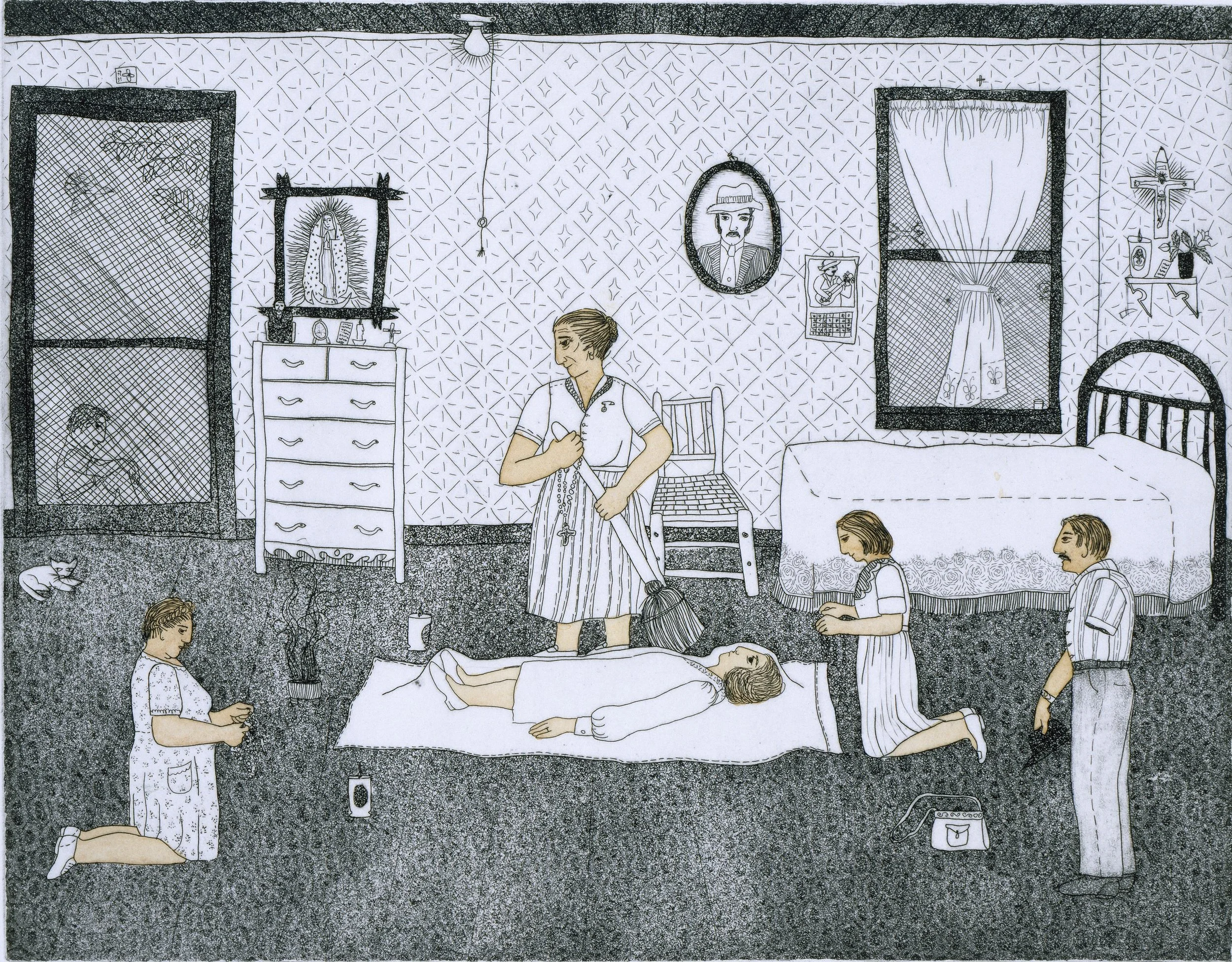 Image caption and credit: Carmen Lomas Garza, La Curandera, ca. 1974, hand-colored etching and aquatint on paper. Smithsonian American Art Museum, Gift of Tomás Ybarra-Frausto.